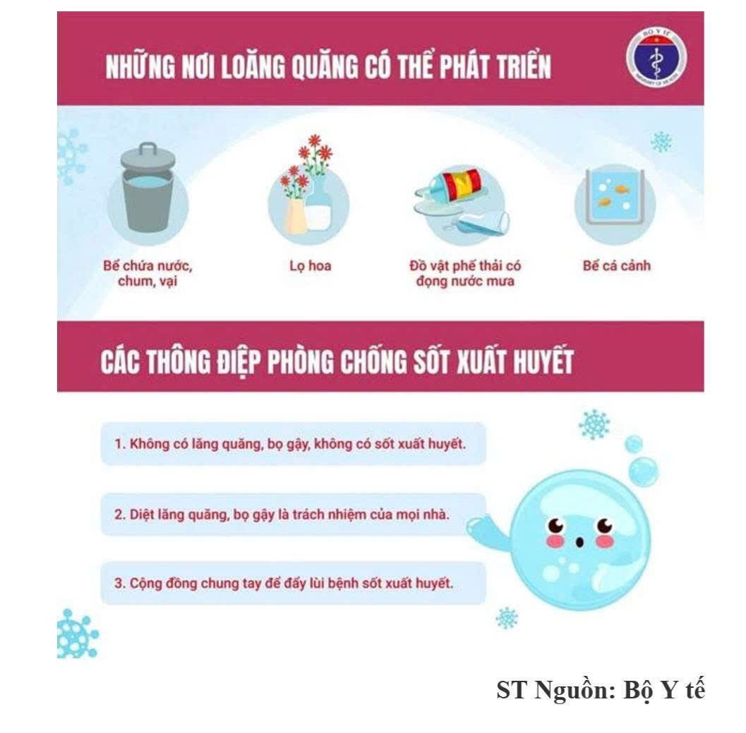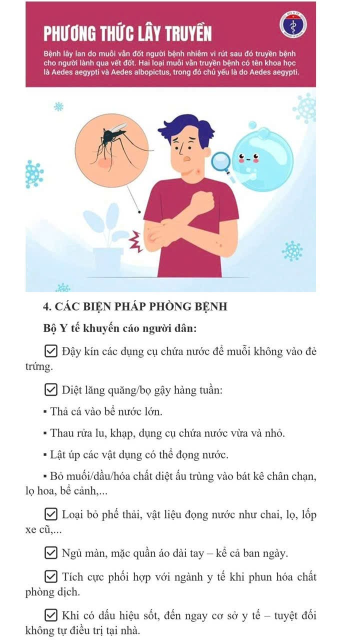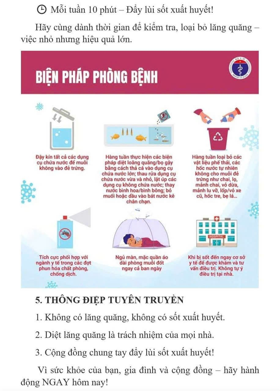 🚨 BỘ Y TẾ KHUYẾN CÁO NGƯỜI DÂN: ✅ Đậy kín các dụng cụ chứa nước để muỗi không vào đẻ trứng. ✅ Diệt lăng quăng/bọ gậy hàng tuần: ▪️ Thả cá vào bể nước lớn. ▪️ Thau rửa lu, khạp, dụng cụ chứa nước vừa và nhỏ. ▪️ Lật úp các vật dụng có thể đọng nước. ▪️ Bỏ muối/dầu/hóa chất diệt ấu trùng vào bát kê chân chạn, lọ hoa, bể cảnh,... ✅ Loại bỏ phế thải, vật liệu đọng nước như chai, lọ, lốp xe cũ,... ✅ Ngủ màn, mặc quần áo dài tay – kể cả ban ngày. ✅ Tích cực phối hợp với ngành y tế khi phun hóa chất phòng dịch. ✅ Khi có dấu hiệu sốt, đến ngay cơ sở y tế – tuyệt đối không tự điều trị tại nhà. 🕒 Mỗi tuần 10 phút – Đẩy lùi sốt xuất huyết! Hãy cùng dành thời gian để kiểm tra, loại bỏ lăng quăng – việc nhỏ nhưng hiệu quả lớn. 📣 Thông điệp tuyên truyền: 1️⃣ Không có lăng quăng, không có sốt xuất huyết. 2️⃣ Diệt lăng quăng là trách nhiệm của mọi nhà. 3️⃣ Cộng đồng chung tay đẩy lùi sốt xuất huyết! 💪 Vì sức khỏe của bạn, gia đình và cộng đồng – hãy hành động NGAY hôm nay!!!
